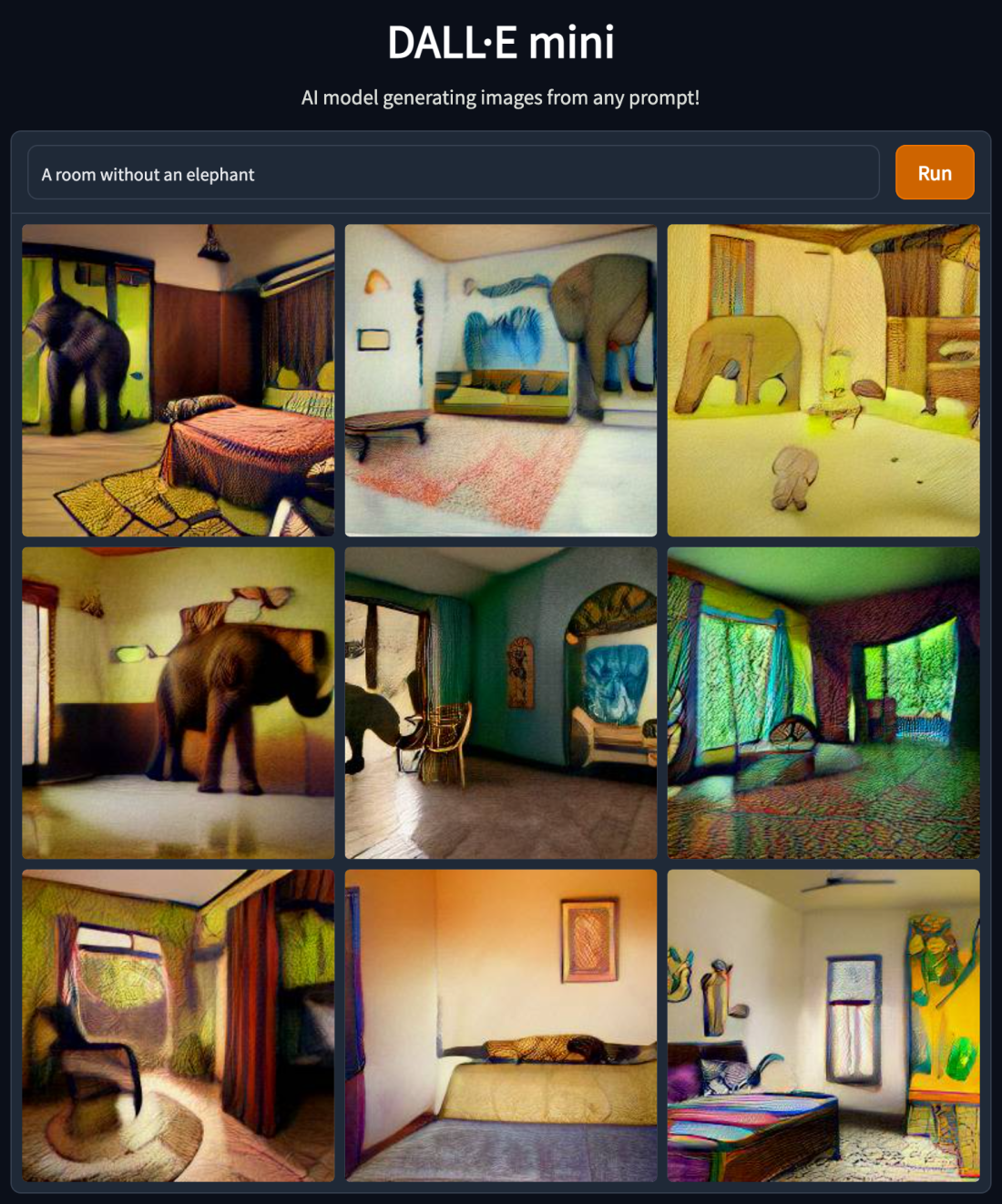 While the results look impressive at first sight, there are some caveats and limitations, including word order and compositionality issues, e.g., “A yellow book and a red vase” from “A red book and a yellow vase” are indistinguishable. Moreover, as one can see in the “A yellow book and a red vase” example below the images or more of the same, another drawback is that the system cannot handle negation, e.g., “A room without an elephant” will create, well, see below. Read more here.